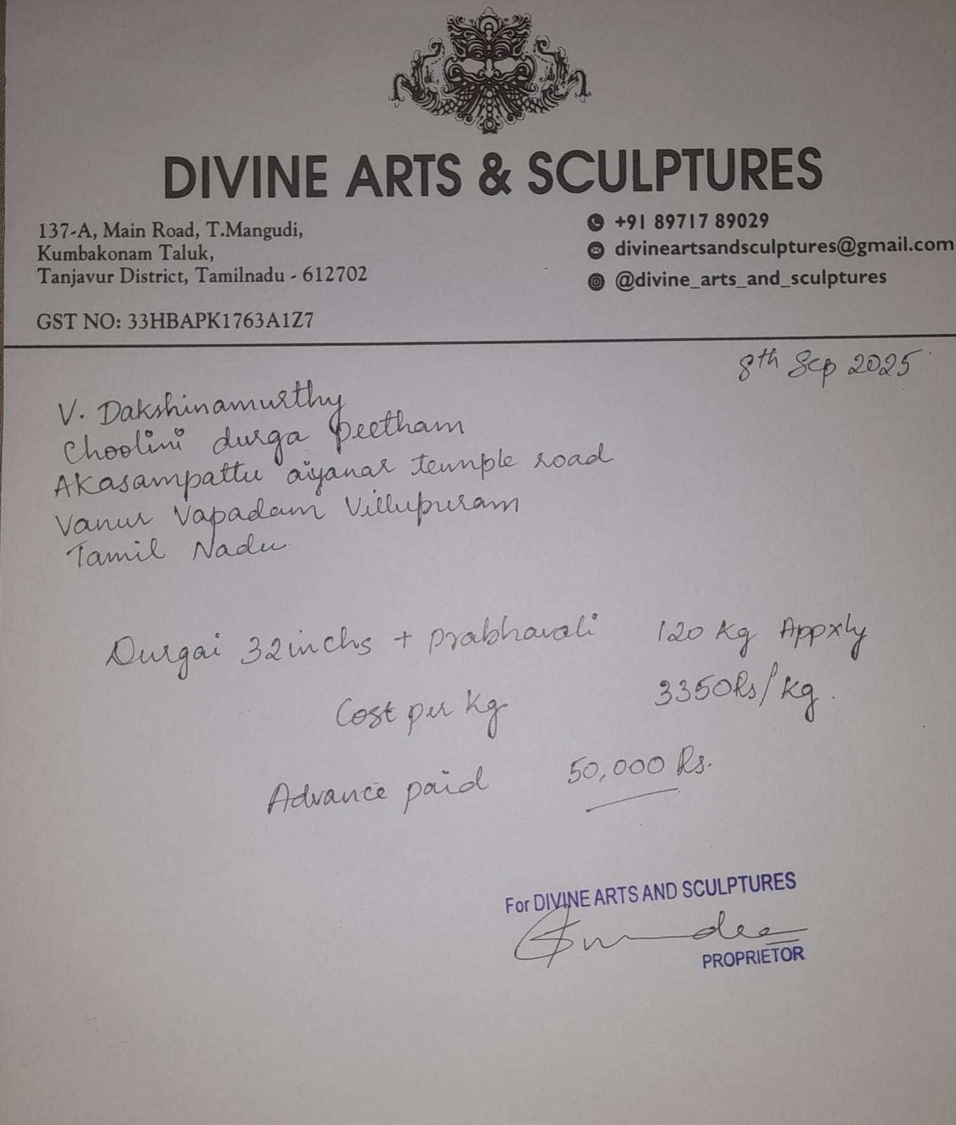 இந்த Order, Divine Arts & Sculptures, கும்பகோணம் நிறுவனத்திடம்